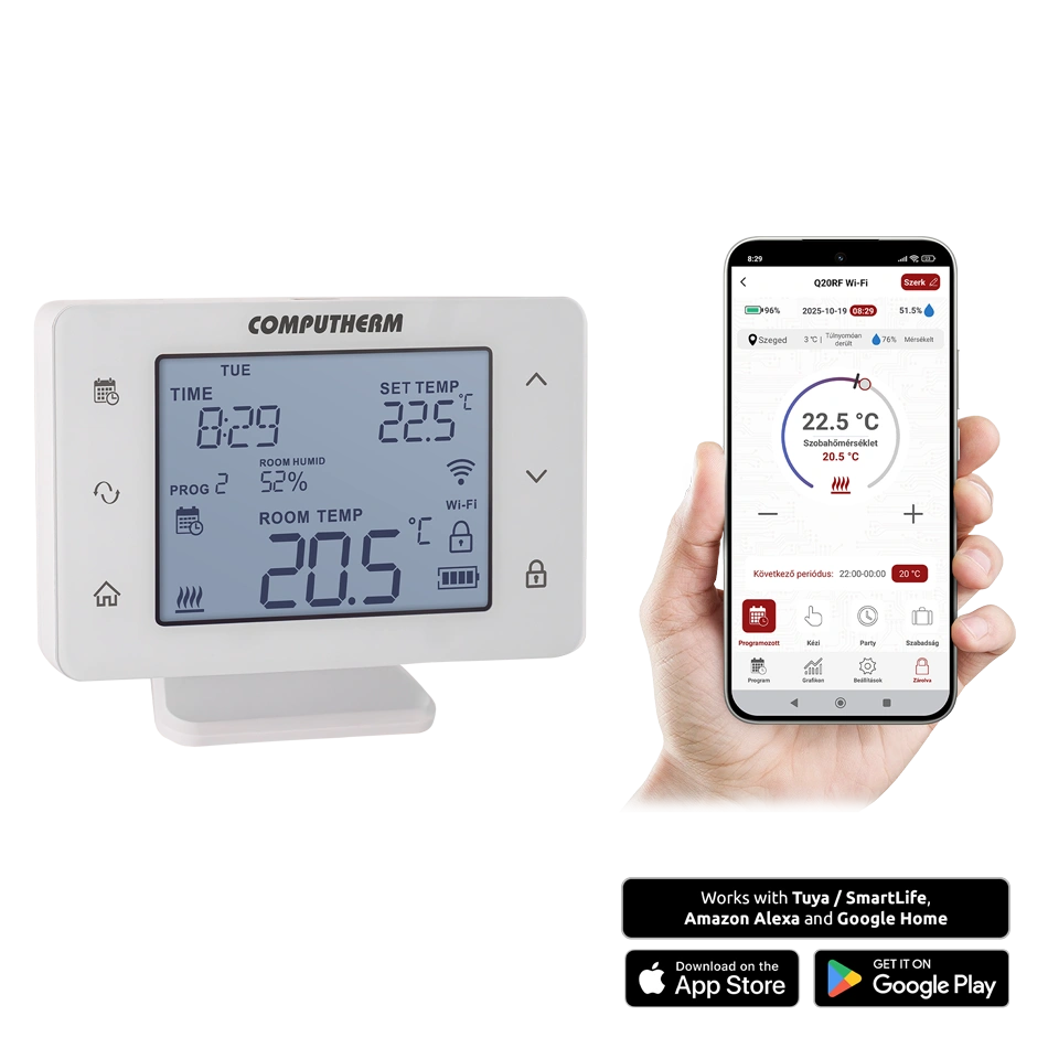 - Дистанционно управление чрез приложението COMPUTHERM Smart , както и чрез системите Tuya / SmartLife , Amazon Alexa и Google Home