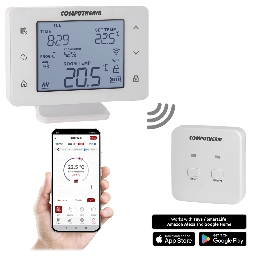 Стаен термостат тип COMPUTHERM Q20RF WIFI с превключващ режим може да управлява голяма част от котлите и климатичните съоръжения, налични на унгарския пазар. Може лесно да се свърже към всеки газов котел с двупроводна точка на свързване на термостат и към всеки климатичен уред или електрически уред, независимо дали имат верига за управление 24 V или 230 V. В допълнение, термостатът е подходящ и за управление на електрически и електронни устройства, които могат да се включват и изключват чрез прекъсване и възобновяване на захранването.