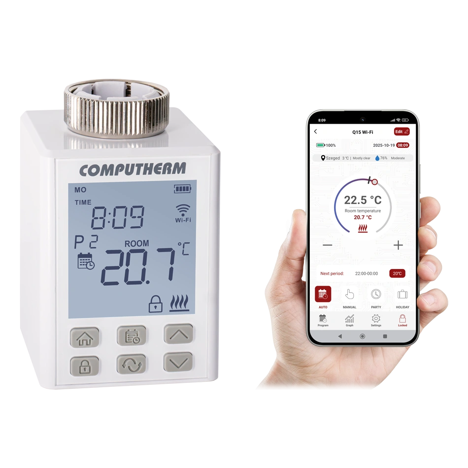 Електронна термоглава COMPUTHERM Q15 WIFI може да се използва както в автоматичен (програмиран), така и в ръчен режим. Термоглава COMPUTHERM Q15 може да бъде програмирана според индивидуалните нужди, за да отоплява даденото помещение до необходимата температура в желаните от вас часове, като същевременно осигурява комфорт и допринася за намаляване на разходите за енергия.