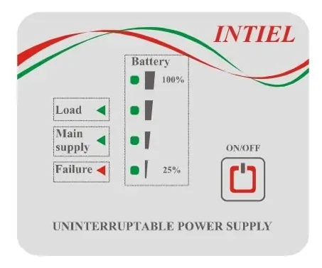 При отпадане на основното захранване остава да свети индикатор „Load“ ако UPS инвертор INTIEL 150W е бил включен от бутона ON/OFF В този случай индикатор “Main supply” не свети и изходното напрежение се получава от акумулаторната батерия посредством DC/AC преобразувател 12V/220V.